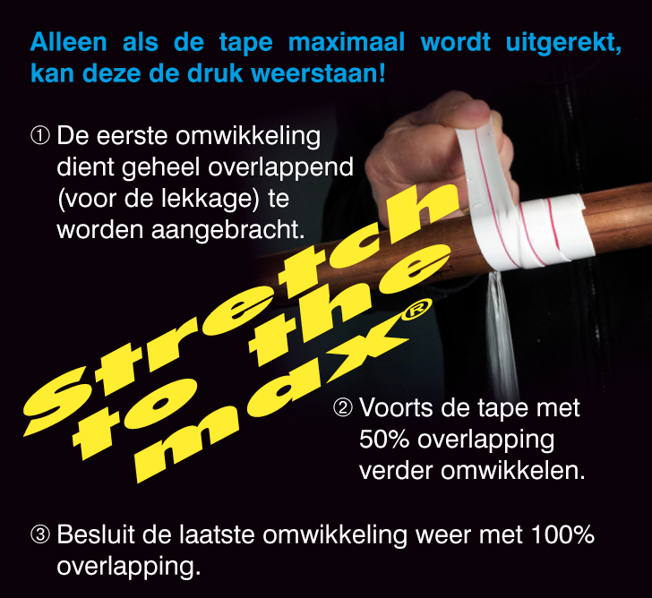 .jpg) | ATTENTIE: In geval van een druklekkage (zoals waterleiding of gasleiding) dient de tape MAXIMAAL te worden uitgerekt , d.w.z. tot aan het "aanslagpunt" (het punt waarbij u de tape niet verder kunt uitrekken).