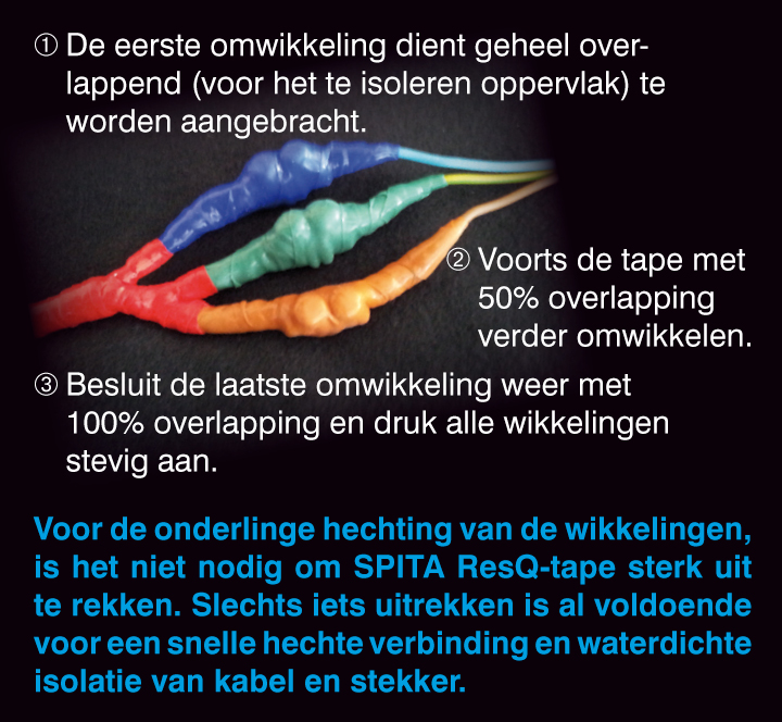 3) SPITA ResQ-tape hoeft niet in één geheel te worden aangebracht. (het werkt meestal eenvoudiger om meerdere (korte) stukken te verwerken).